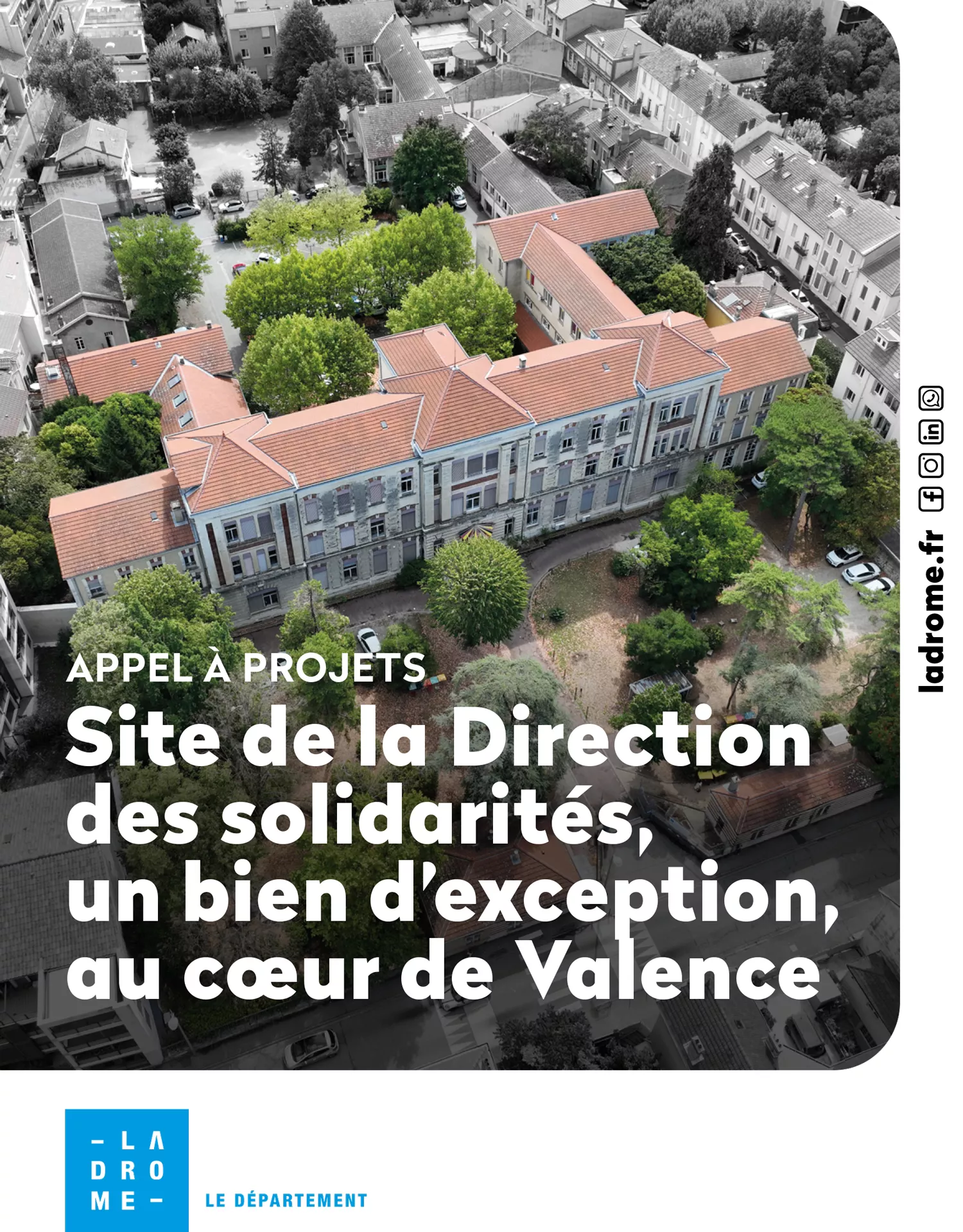 Le Département de la Drôme, 26 avenue du Président Herriot 26026 VALENCE cedex 9, représenté par Madame Marie-Pierre Mouton Présidente du Conseil départemental, organise un appel à projets en vue de la cession du site de la Direction des solidarités de Valence (26)