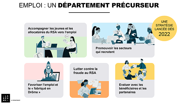 Le Département de la Drôme, précurseur en la matière, a décidé dès 2020 de s’intéresser à la rénovation du parcours insertion pour homogénéiser la procédure et réduire les délais d’attente des demandeurs du RSA – 10 690 inscrits en juin 2022. Dans le cadre de sa stratégie emploi 2022/2028, « Un Département mobilisé pour l’emploi d’abord », le Conseil Départemental a réaffirmé son soutien à l’accompagnement des allocataires du RSA et des jeunes vers l’emploi grâce à un nouveau dispositif qui assure une orientation en un mois maximum, un rendez-vous avec le référent unique en moins de 15 jours et des rendez-vous mensuels de suivi. En parallèle, le Département s’est engagé sur une plus grande facilité d’accès physique et numérique des allocataires du RSA ainsi que sur la mutualisation de l’offre de formation et d’insertion…
