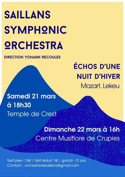 Le Saillans Symphonic Orchestra est heureux de vous présenter ses deux concerts à venir ! Une nouvelle occasion d’entendre notre dernier programme si vous l’avez apprécié en décembre ou de le découvrir si vous n’avez pas eu l’occasion de l’entendre !