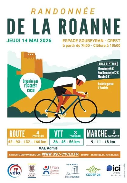 Randonnée cyclotouriste route et VTT. Pour les accompagnants et spectateurs : visite guidée de Crest (inscriptions sur place) !